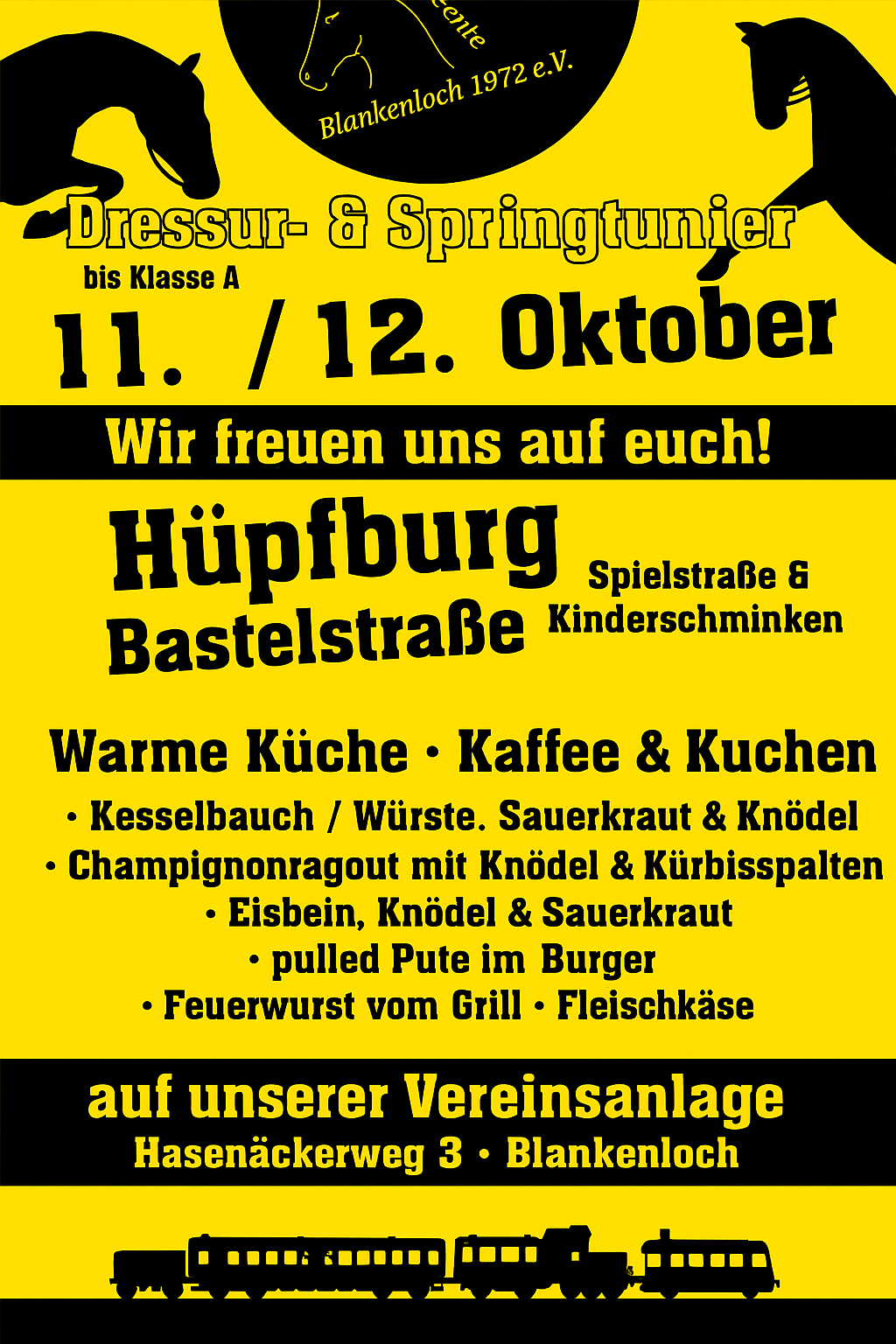Freut euch auf ein spannendes Wochenende beim Reitturnier bis Klasse A – mit großem Rahmenprogramm für die ganze Familie! Neben beeindruckenden Dressur- und Springwettbewerben gibt es auch jede Menge Spaß für Kinder mit Hüpfburg, Bastelstraße, Spielstraße und Kinderschminken.