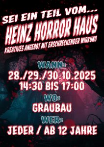 Traust du dich ins Heinz Horror Haus? In den Herbstferien verwandelt sich der GrauBau in ein kreatives Gruselhaus! Gemeinsam werden schaurige Kulissen gebaut und schrecklich schöne Effekte gestaltet – alles mit Fantasie, Farbe und viel Spaß.