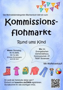 Der Michaeliskindergarten Blankenloch lädt herzlich zum Kommissionsflohmarkt „Rund ums Kind“ ein. Angeboten werden Kinderkleidung, Spielsachen, Bücher und vieles mehr. Für das leibliche Wohl ist mit einem Waffelverkauf gesorgt.