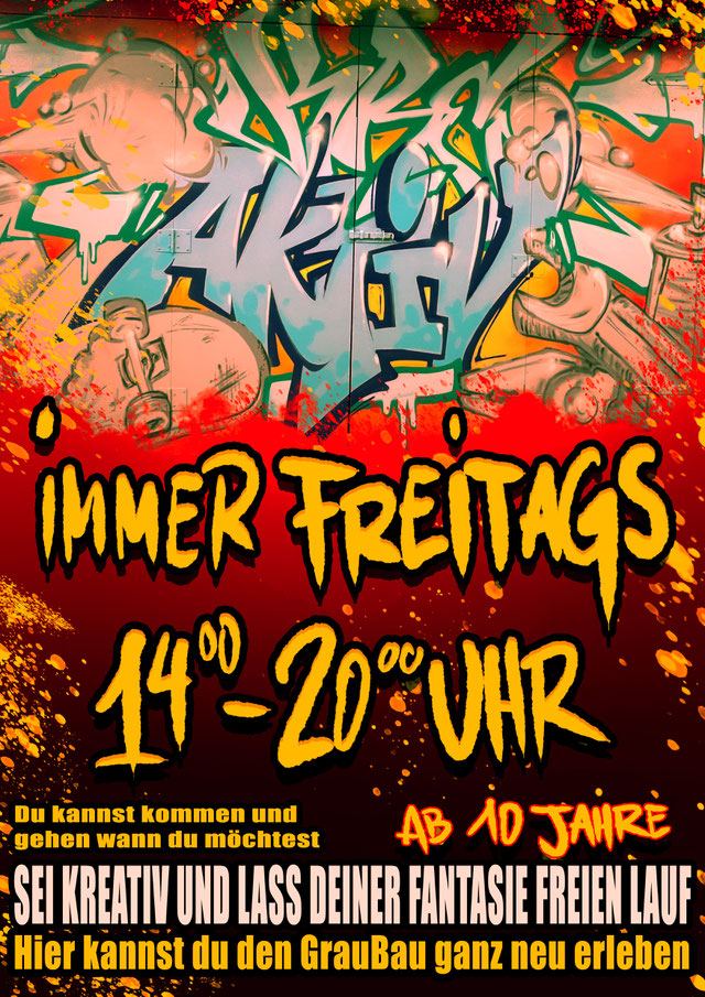 Am Kreativfreitag kannst du deiner Fantasie freien Lauf lassen! Ob Malen, Basteln, Gestalten oder einfach Ausprobieren – hier kannst du dich kreativ austoben, neue Ideen entdecken und den GrauBau ganz neu erleben. Du kannst kommen und gehen, wann du möchtest. Für Kinder und Jugendliche ab 10 Jahren. Jeden Freitag, 14:00 – 20:00 Uhr.