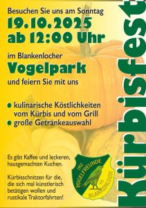 Der Herbst wird gefeiert! Beim traditionellen Kürbisfest im Blankenlocher Vogelpark erwarten euch leckere Kürbisgerichte, Köstlichkeiten vom Grill, Kaffee, hausgemachter Kuchen und eine große Getränkeauswahl.