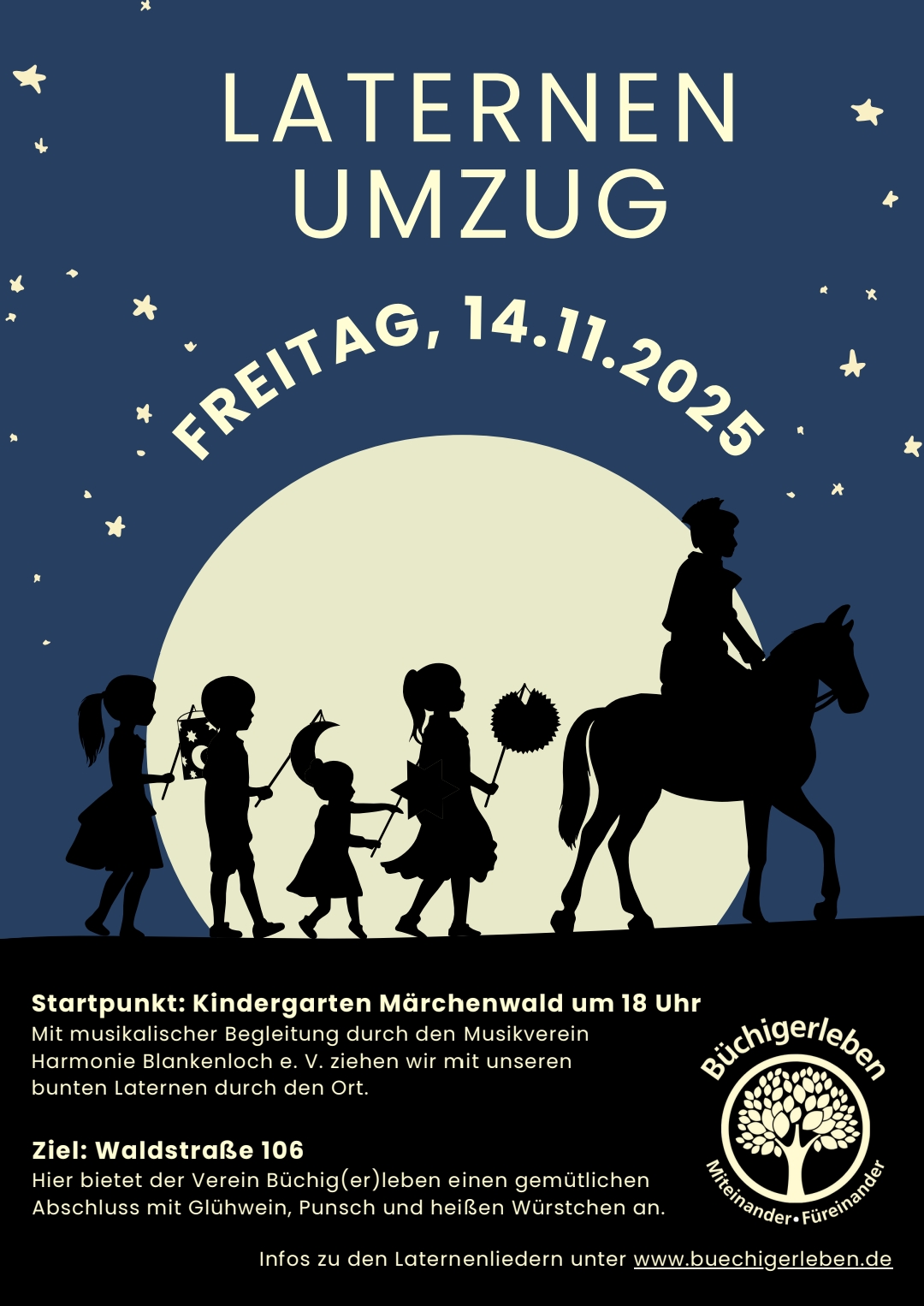 Der Laternenumzug (mit Musik!) startet an der Kita Märchenwald (Sterntalerstr. 2) um 18 Uhr. Anschließend gibt es eine Umtrunk mit Glühwein, Punsch und heißen Würstchen in der Waldstraße 106.