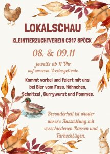 Der Kleintierzuchtverein C317 Spöck lädt zur traditionellen Lokalschau ein. Freut euch auf eine schöne Ausstellung mit verschiedenen Rassen und Farbschlägen – ein spannendes Erlebnis für die ganze Familie. Für das leibliche Wohl ist bestens gesorgt.